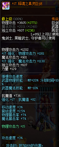 极品骚器鬼剑士 +17释魂之真灵巨剑 秒增幅15/16释魂巨剑太刀光剑六瓣15魔剑 攻击很牛X 自己看属性图