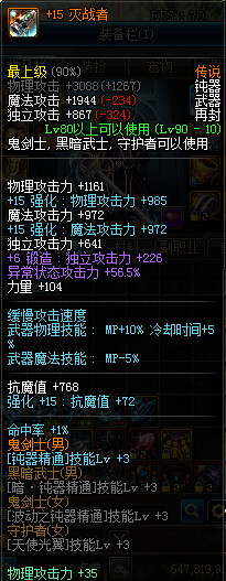 +15灭战者 鬼剑士黑暗武士守护者 90传说钝器,附魔物攻,秒15/16释魂之真灵太刀光剑,跨一通用,出坑低价甩装备
