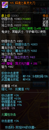 +15释魂之真灵太刀 鬼剑士传说太刀 增幅+15红字异次元281力量,完美属性秒杀一切